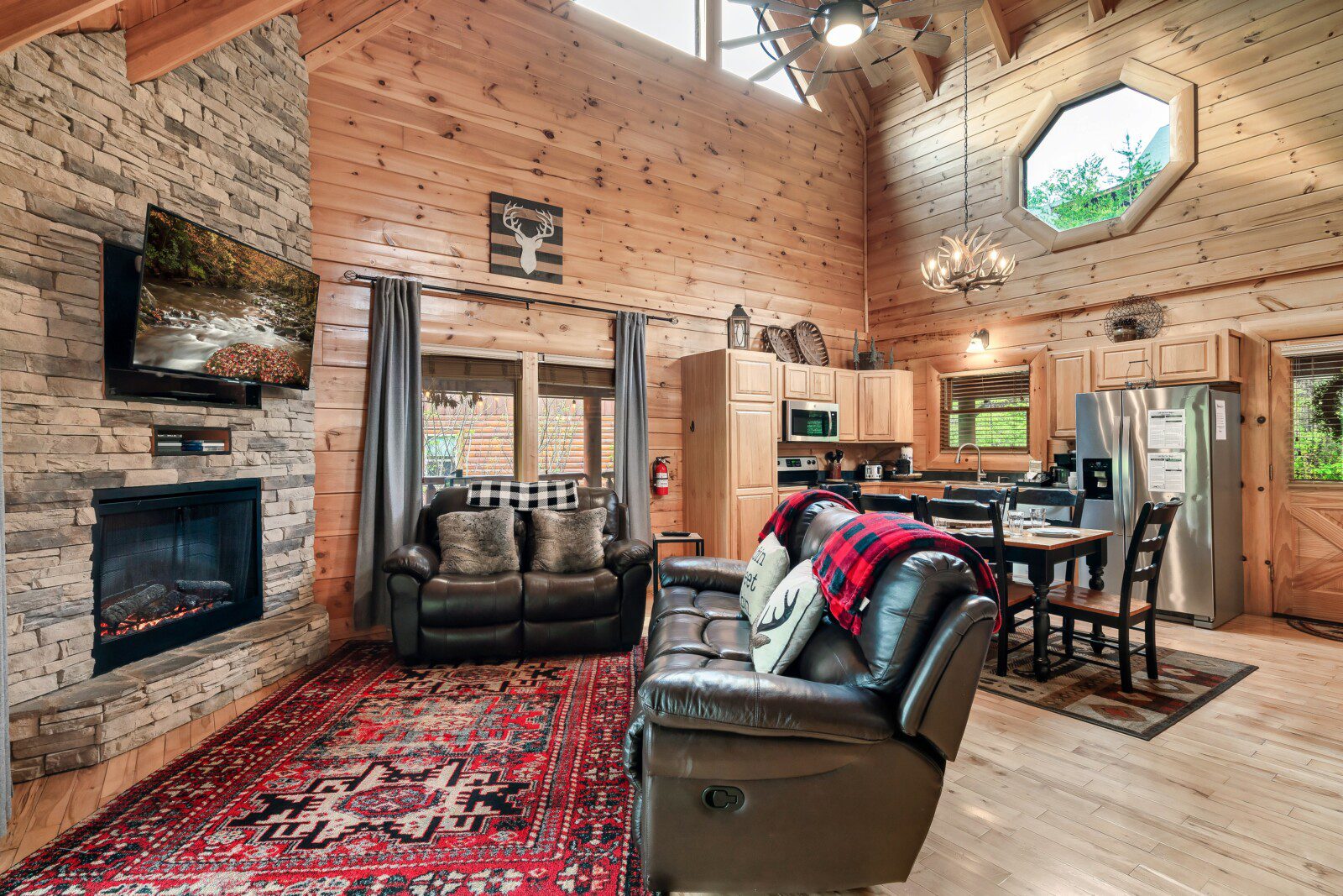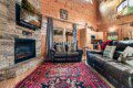 🛋 Living Room: Open concept with queen pull-out sofa, electric fireplace, and large TV